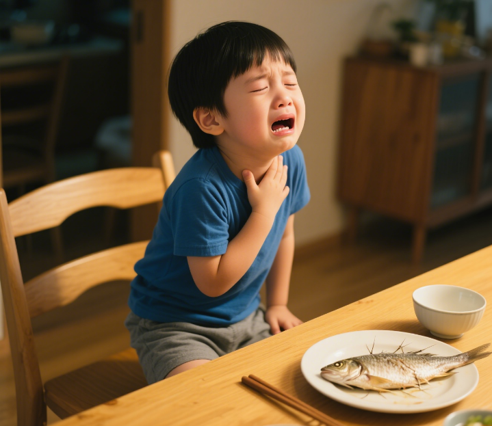 孩子卡鱼刺后,家长不要惊慌,先安抚情绪,避免孩子哭闹时误吸鱼刺(哭闹时呼吸急促,鱼刺可能掉入气管);