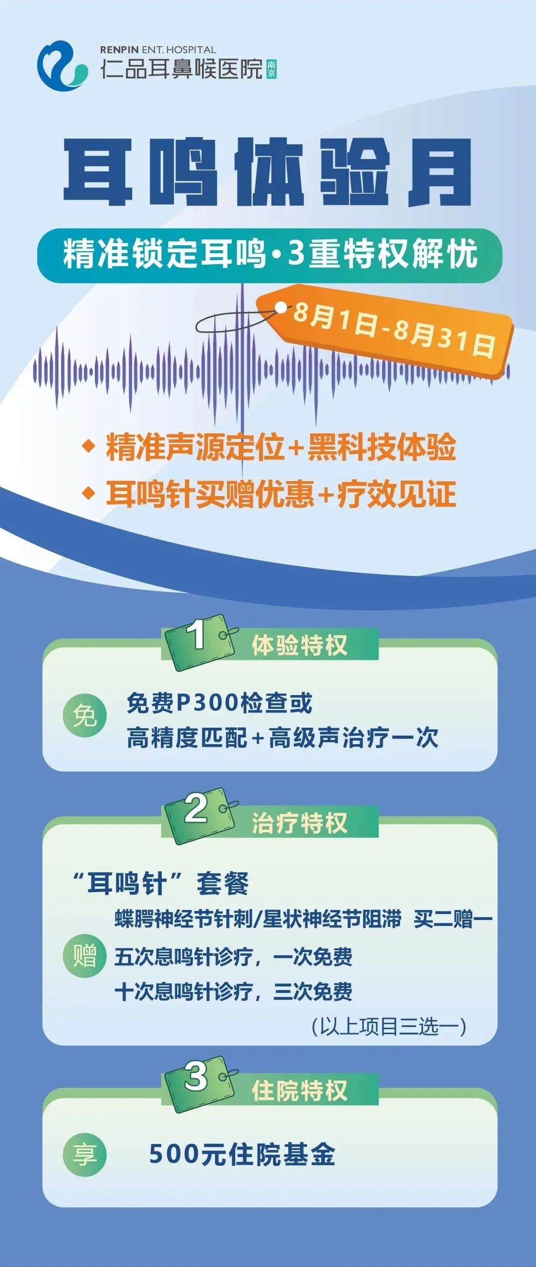 目前,南京仁品8月耳鸣体验月活动正在进行中,添加客服微信报名预约可以免费体验P300检查一次,让耳鸣患者能获得最适合自己的治疗方案,同时还有“耳鸣针”治疗优惠以及500元住院基金限时可享。让我们一起借助先进的医疗技术,向“头脑中的噪音”说再见,重拾宁静美好的生活↓↓