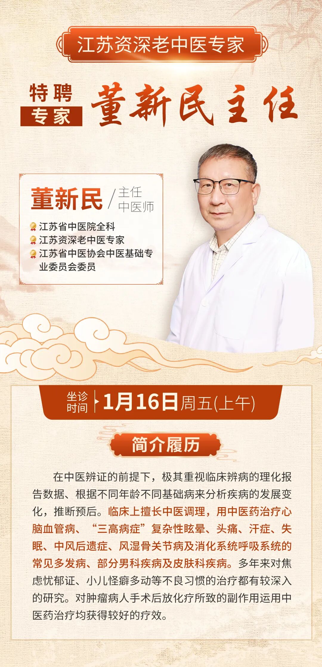 为满足公众对中医防治糖尿病的需求,1月16日周五上午,南京仁品将特邀江苏省中医院主任中医师董新民坐诊,专门针对高血糖、高血压、高血脂等代谢性疾病提供中医调理方案。董新民主任擅长运用中医理论调理“三高”病症,在糖尿病前期干预、并发症防治及个体化养生指导方面经验丰富,将结合患者年龄、体质制定个性化调理方案,有需要的市民可以提前预约。预约电话:025-85262032